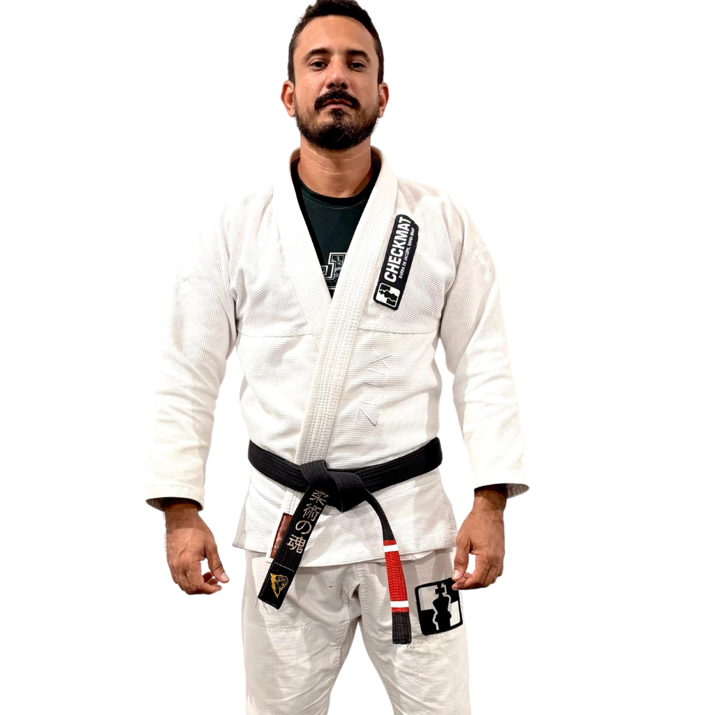 Lapela com triplo reforço e patches da equipe aplicados no kimono.